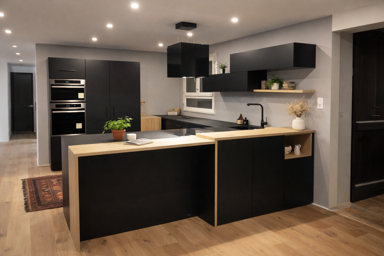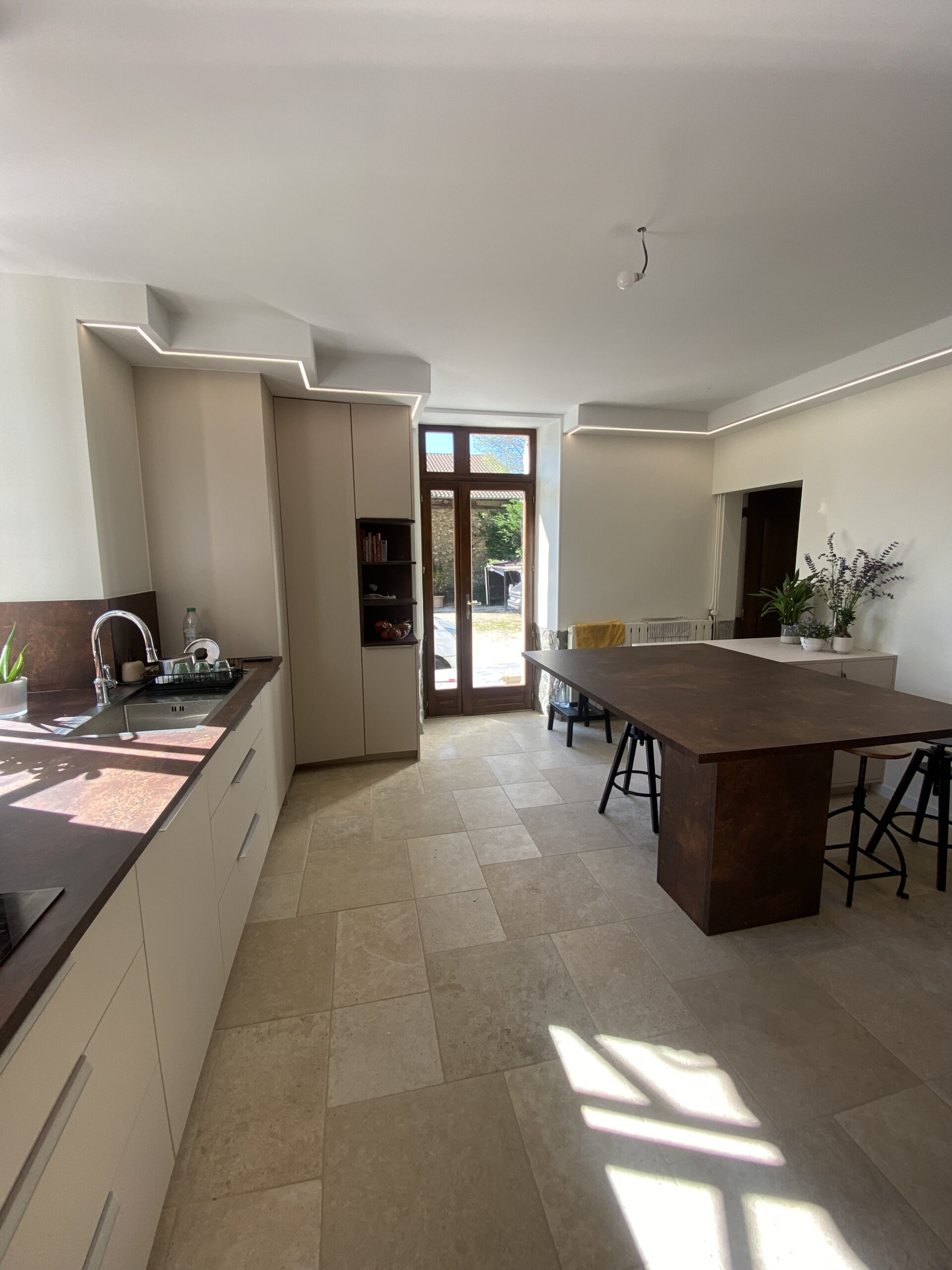 Îlot central, rangements toute hauteur et éclairage intégré pour un espace fonctionnel et intemporel.
